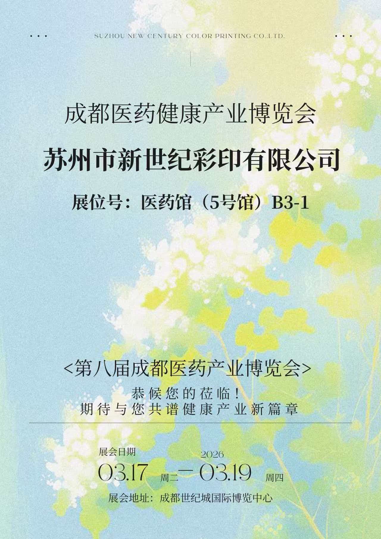 Vom 17. bis 19. März 2026 fand im Internationales Kongress- und Ausstellungszentrum Chengdu Century City die 8. Chengdu Medical and Health Industry Expo statt. Suzhou New Century Color Printing Co., Ltd. (im Folgenden „New Century Printing“ genannt) stellte seine neuesten Errungenschaften im Bereich Pharmaverpackungen vor Stand B3-1 in der Pharmazeutischen Halle (Halle 5) und präsentiert umfassend seine umfassende Stärke in den Bereichen Pharmaverpackungsdruck, Strukturdesign und Compliance-Dienstleistungen. Zahlreiche Pharmaunternehmen und Branchenexperten kamen hierher und tauschten sich aus.
